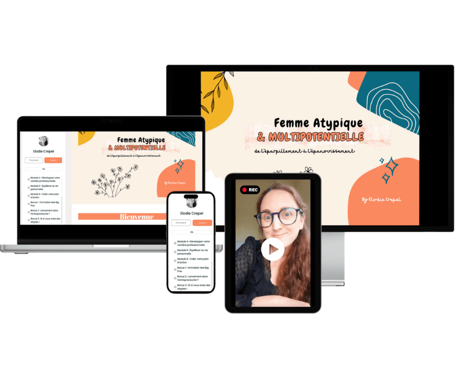 Cette formation "Femme atypique & Multipotentielle" est donc l’aboutissement de mes explorations et expériences variées : je vous propose des outils pratiques et des stratégies pour que vous puissiez, vous aussi, tirer partie de vos talents uniques et multiples.