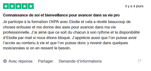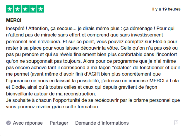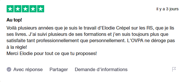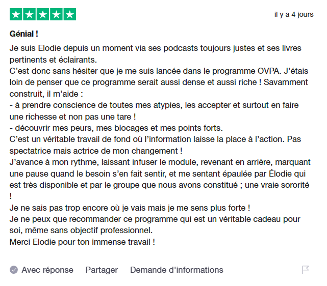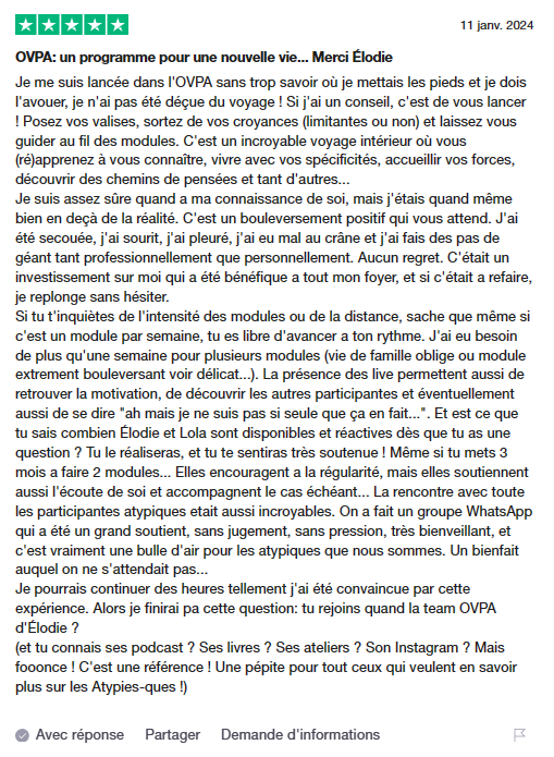 Vous avez la possibilité de réserver un rendez-vous gratuit de 30 minutes avec Lola, co-créatrice du programme depuis trois ans. Cet échange ne constitue pas un diagnostic et ne génère aucun revenu supplémentaire en cas d’inscription, garantissant ainsi une approche éthique. Son objectif est de répondre à vos questions et de déterminer si le programme OVPA correspond à vos besoins.